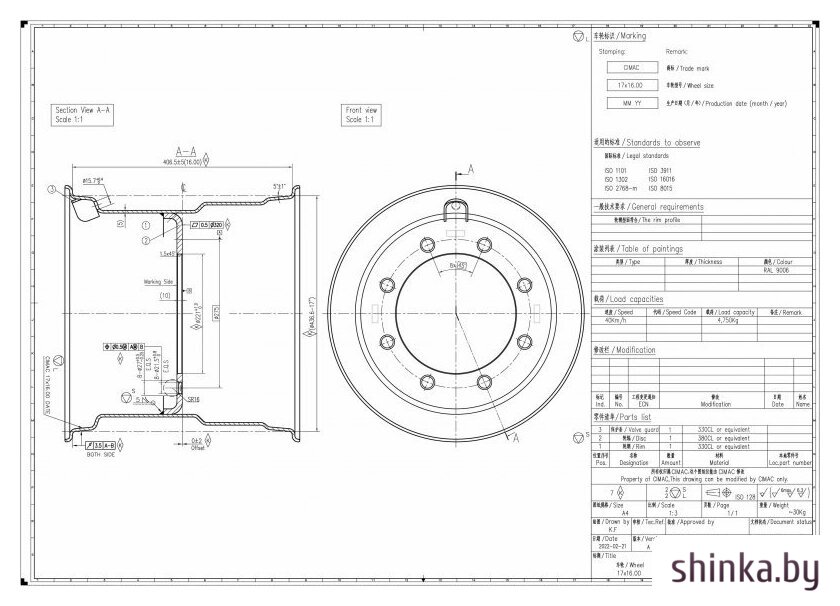 | Посадочный диаметр | 17 " |